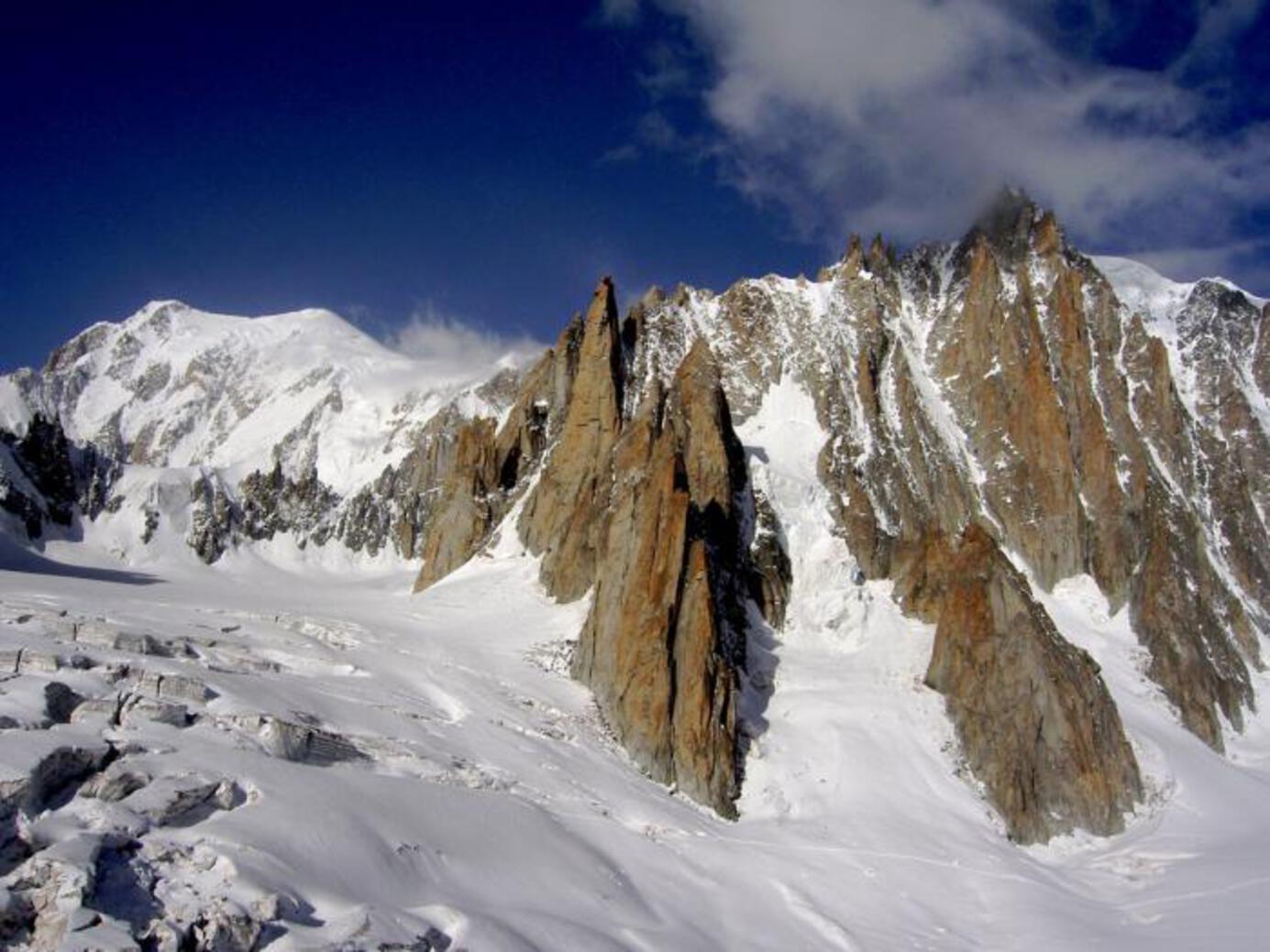 la vicina Aiguille Noire de Peuterey (3.773 m) è uno dei simboli del Monte Bianco nel versante italiano ed è la cima più importante della spettacolare Cresta di Peuterey